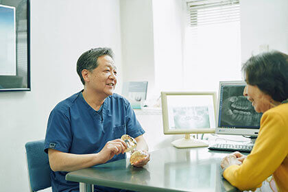 検査結果を患者さまと共有し、現在のお口の状態をお伝えします。そして、考えられる治療法について、丁寧にご説明します。専門用語はなるべく使わず、分かりやすくお話しますのでご安心ください。